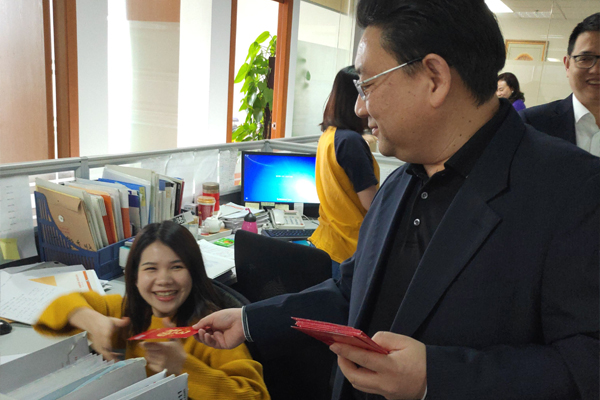 二月十四日,大年初十,兆新股份迎來了新春后的第一個工作日,公司領導層集體出動,到員工崗位親自派發開工利是,向公司全體員工們致以新春祝福,用開工大吉的紅包,喜迎同仁們的歸來,預示新的一年,紅紅火火大吉大利。